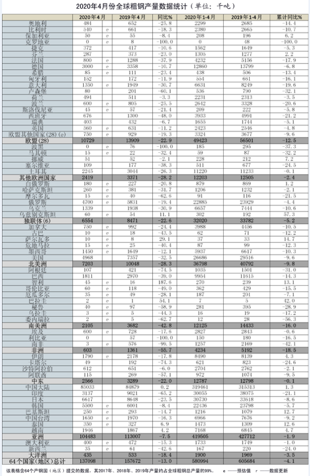 從重點(diǎn)國家和地區(qū)來看,4月份,中國大陸粗鋼產(chǎn)量為8503萬噸,同比增長(zhǎng)0.2%;印度粗鋼產(chǎn)量為314萬噸,同比下降65.2%;日本粗鋼產(chǎn)量為662萬噸,同比下降23.5%;韓國預(yù)估粗鋼產(chǎn)量為550萬噸,同比下降8.4%。歐盟國家中,德國預(yù)估粗鋼產(chǎn)量為300萬噸,同比下降10.7%;意大利粗鋼產(chǎn)量為135萬噸,同比下降30.7%;法國預(yù)估粗鋼產(chǎn)量為80萬噸,同比下降37.9%;西班牙粗鋼產(chǎn)量為67.6萬噸,同比下降48.0%。美國粗鋼產(chǎn)量為497萬噸,同比下降32.5%。俄羅斯預(yù)估粗鋼產(chǎn)量為470萬噸,同比下降19.4%;烏克蘭粗鋼產(chǎn)量為134萬噸,同比下降30.9%。巴西粗鋼產(chǎn)量為181萬噸,同比下降39.0%。土耳其粗鋼產(chǎn)量為225萬噸,同比下降26.3%。